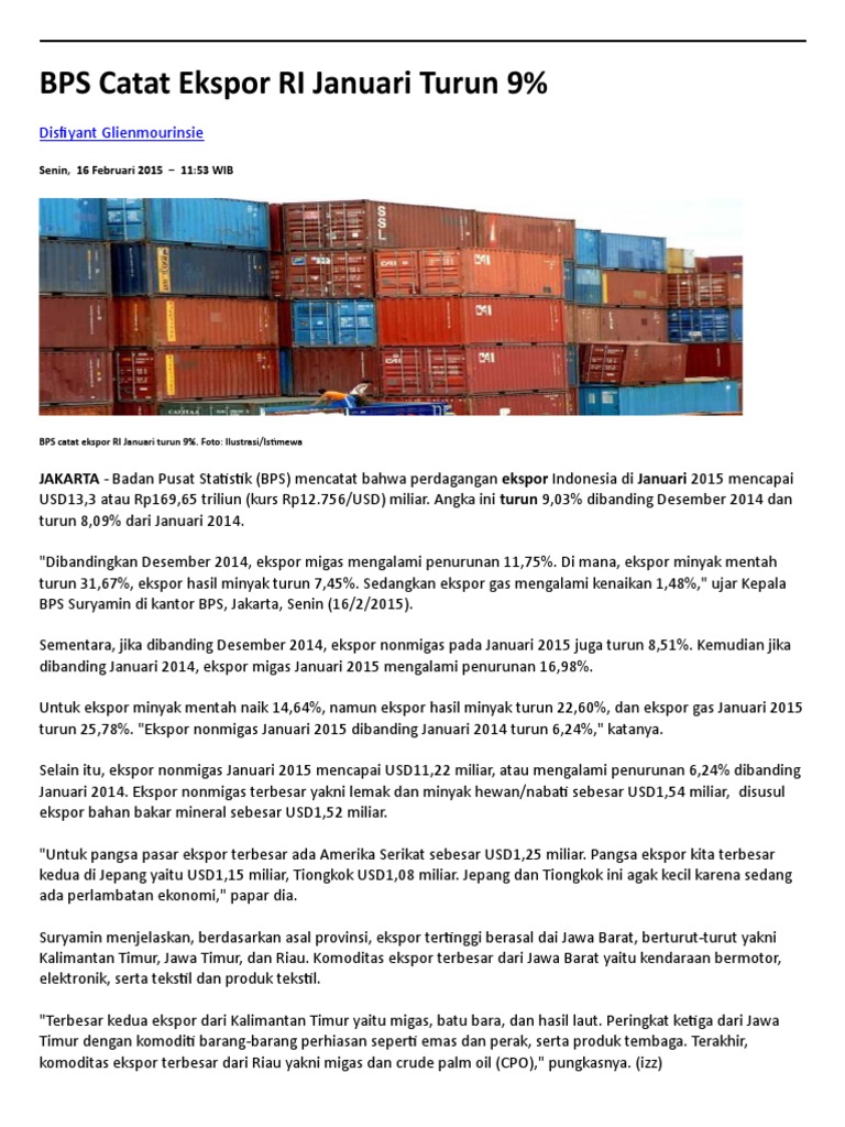 Bps Ekspor Nonmigas Indonesia Terpaku Ke 3 Negara Cina